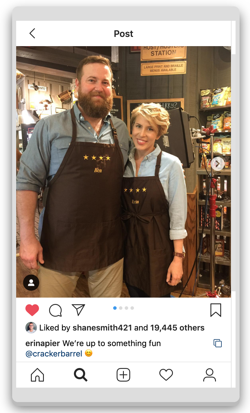 A one-day shoot led to almost 20 pieces of unplanned, unique content for both Ben & Erin and Cracker Barrel to share across their channels, and drove hundreds of thousands of new interactions with the brand, thanks to our shared fanbase. The content was scripted, but the most authentic pieces came to life in the moments when Ben & Erin’s genuine love for each other - and Cracker Barrel - shone through.